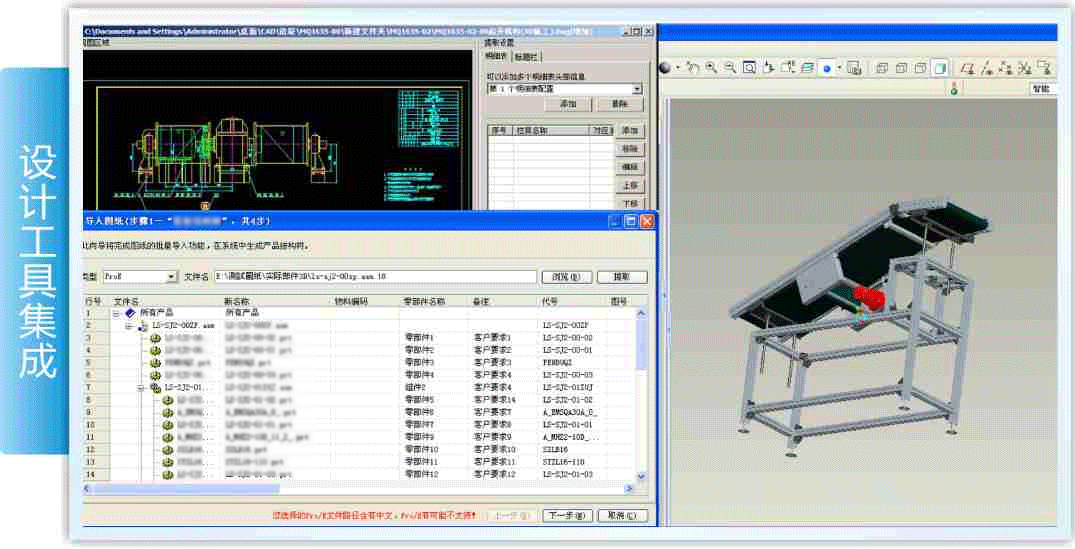 ●對(duì)整套已完成的產(chǎn)品Autocad或ProE圖紙進(jìn)行產(chǎn)品結(jié)構(gòu)分析,直接生成多層產(chǎn)品明細(xì)表(產(chǎn)品BOM),并保證圖紙修改后,對(duì)應(yīng)零部件的信息自動(dòng)同步更新。