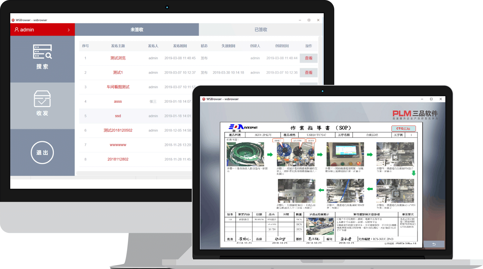 PLM收發(fā)管理模塊與PC端看板信息同步,在PLM系統(tǒng)發(fā)布后可立即在PC端看板里簽收查看發(fā)布內(nèi)容。車間看板收發(fā)管理分為“未簽收”和“已簽收”兩個模塊。只有簽收后才能查看發(fā)布的內(nèi)容,未簽收的發(fā)布內(nèi)容不能直接查看。選擇已簽收的發(fā)布,點擊查看按鈕可直接在線瀏覽文檔內(nèi)容。