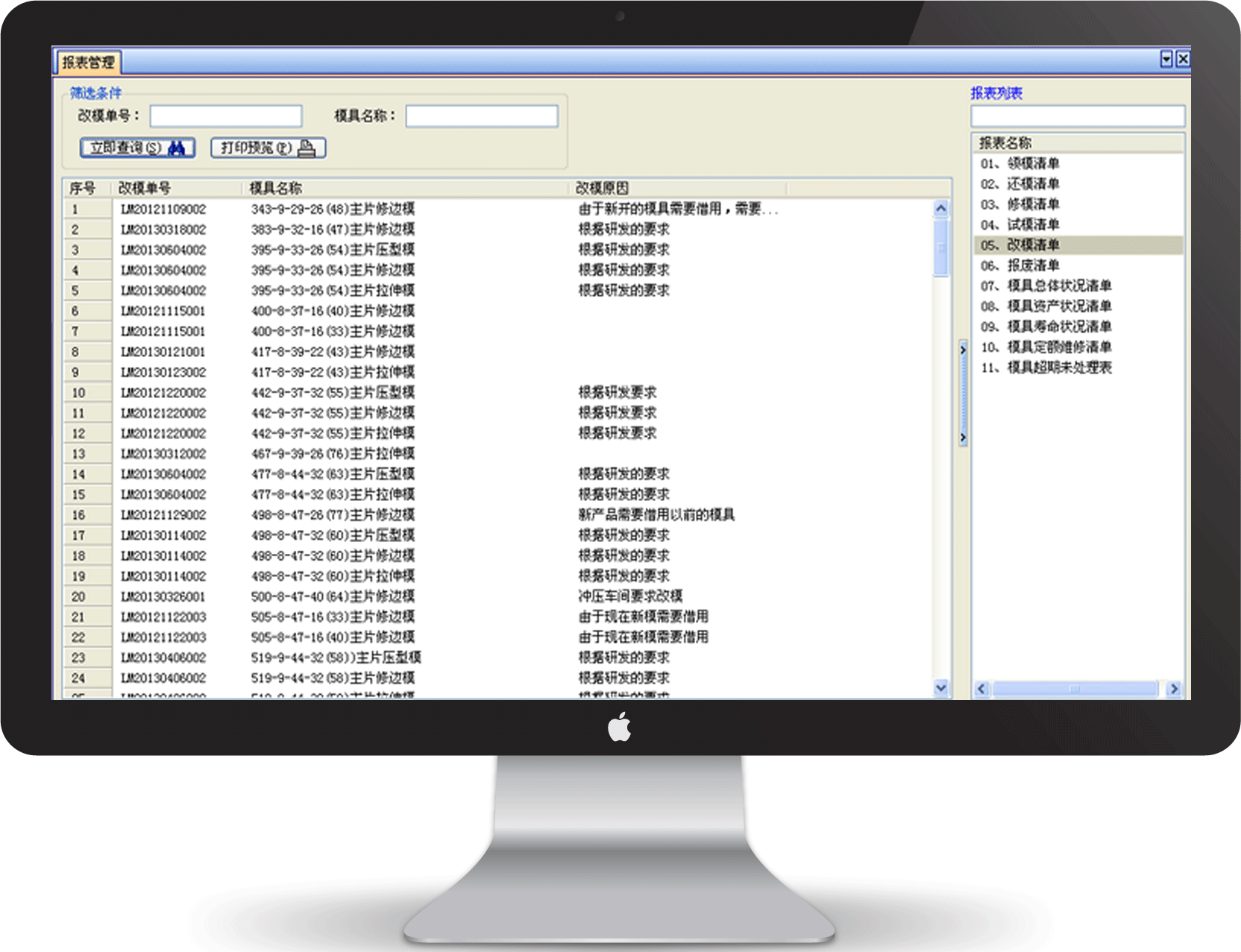提供模具的基本信息、模具資產(chǎn)狀況、壽命狀況、維修計劃及其執(zhí)行情況等的查詢與跟蹤,并根據(jù)需要導(dǎo)出報表。