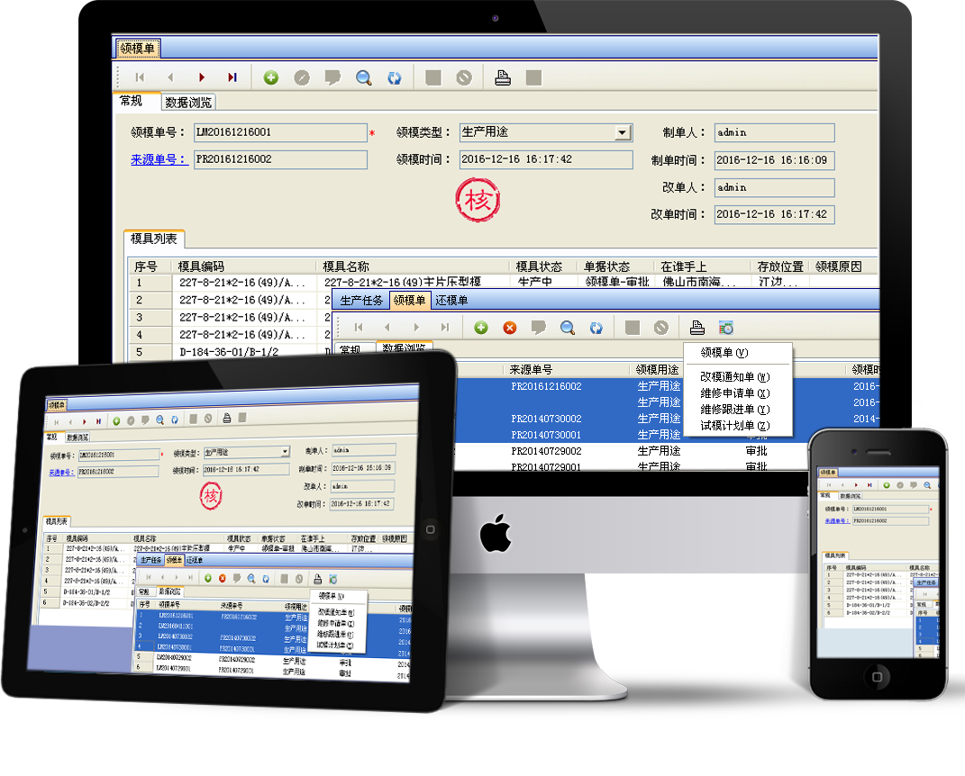 管理模具在生產(chǎn)過程中的申請、領(lǐng)用、歸還等業(yè)務(wù),用于規(guī)范模具從模倉到生產(chǎn)班組的領(lǐng)用與歸還制度,促使作業(yè)人員規(guī)范的領(lǐng)用模具,用完后及時歸還模具,保證模具的可靠性與可追溯性。