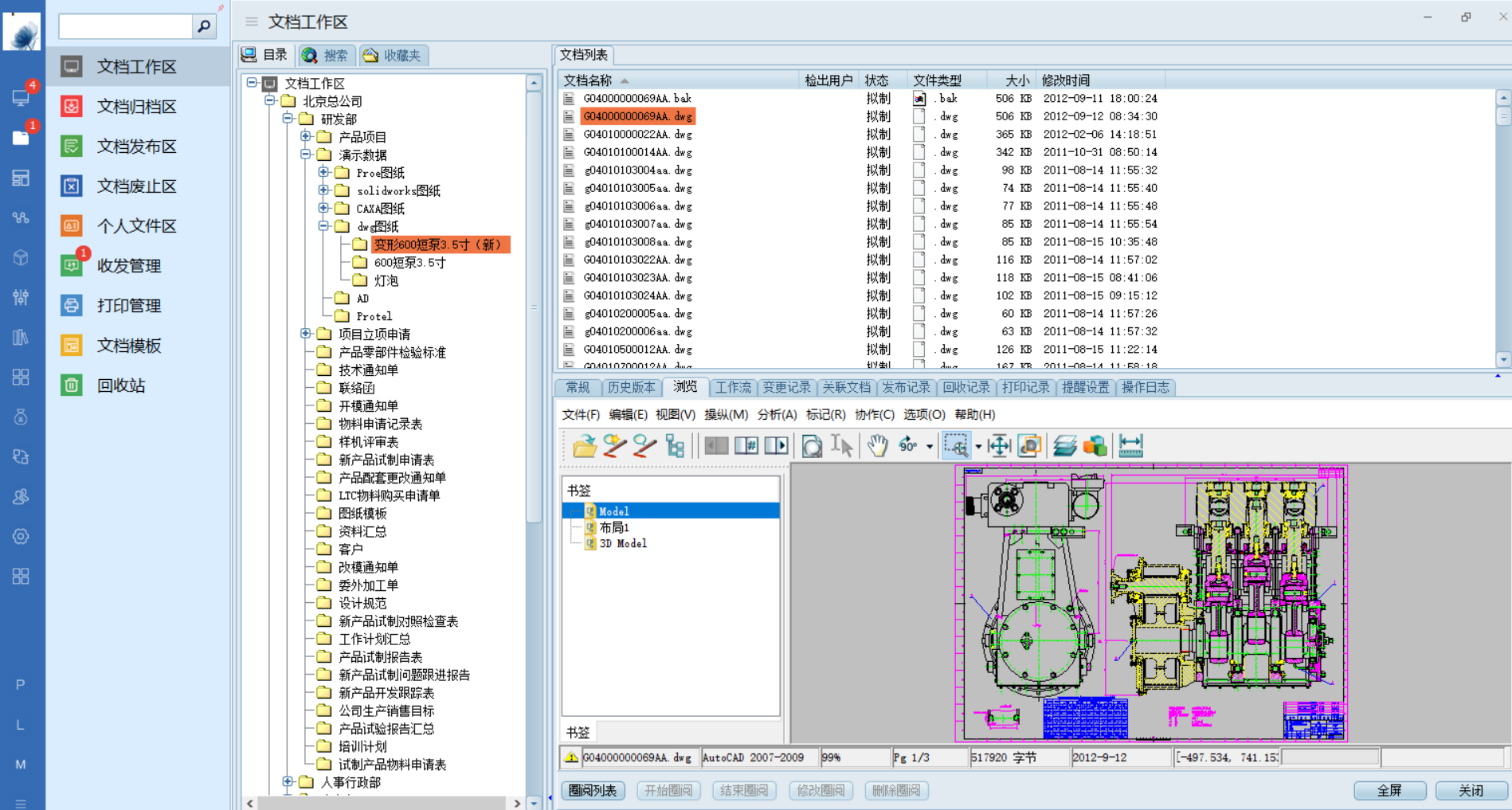 過去對圖紙的審批都是在紙上用手工簽字,而使用CAD后,特別是使用三維CAD后,對計算機文件就無法沿用手工簽字方法業(yè)進行校對、審批及控制文件的發(fā)放。EDM采用電子方式對文件進行提交、審批和發(fā)放,用友好的窗口界面提示各有關領導進行審批,并采用電子記錄方式永久保存審批者的保留意見。通過EDM的流程管理,使已歸檔的文檔都在計算機上經過了審批或變更流程,保證了系統(tǒng)中產品數(shù)據的準確性。以此為基礎,以電子為介質的無紙化辦公及數(shù)字化管理才成為可能。
