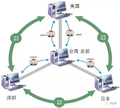 數(shù)據(jù)庫(kù)儲(chǔ)存在一個(gè)服務(wù)器上,電子倉(cāng)可以分別存儲(chǔ)在不同的服務(wù)器上。因此各地共用同一個(gè)數(shù)據(jù)庫(kù)服務(wù)器,分別設(shè)置不同的文件服務(wù)器,并基于統(tǒng)一網(wǎng)絡(luò)進(jìn)行服務(wù)器間的連通,使產(chǎn)品開(kāi)發(fā)的設(shè)計(jì)成果及設(shè)計(jì)任務(wù)等信息能夠并行、及時(shí)地溝通與共享。如在某地同時(shí)部署數(shù)據(jù)庫(kù)服務(wù)器和文件服務(wù)器(可處于同一臺(tái)服務(wù)器),在其它地方的研發(fā)中心分別部署文件服務(wù)器,所有文件服務(wù)器都完全同步,并且都鏈接到數(shù)據(jù)庫(kù)服務(wù)器。