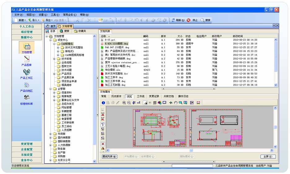 利用三品EDM系統(tǒng)建立企業(yè)級(jí)電子化的圖文檔管理中心,通過(guò)強(qiáng)大的圖文檔生命周期管理功能,使得企業(yè)各級(jí)應(yīng)用人員能夠在企業(yè)統(tǒng)一的平臺(tái)上,支持從概念創(chuàng)意、設(shè)計(jì)、工藝、樣機(jī)制作、生產(chǎn)制造、銷售、維護(hù)到報(bào)廢產(chǎn)品全生命周期各個(gè)階段的信息創(chuàng)建、協(xié)同、應(yīng)用和管理。通過(guò)建立企業(yè)圖文檔數(shù)據(jù)中心,則企業(yè)要求各個(gè)部門取消各自部門的數(shù)據(jù)服務(wù)器,而將數(shù)據(jù)存儲(chǔ)到統(tǒng)一的企業(yè)圖文檔管理中心,并實(shí)現(xiàn)企業(yè)圖文檔數(shù)據(jù)中心7×24小時(shí)對(duì)用戶部門開放,所有應(yīng)用人員能夠在權(quán)限控制的基礎(chǔ)上上傳、下載、申請(qǐng)借閱各類圖文檔資料,從而能夠: