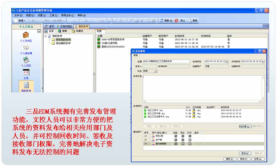 同時(shí)三品EDM系統(tǒng)擁有完善的發(fā)布管理功能,文控人員可以方便快捷的查看發(fā)布記錄、控制發(fā)布的時(shí)效(智能回收)、管理簽收工作和控制發(fā)布資料對(duì)應(yīng)的應(yīng)用部門的權(quán)限。發(fā)布管理是企業(yè)圖文檔管理很重要的一環(huán)。
