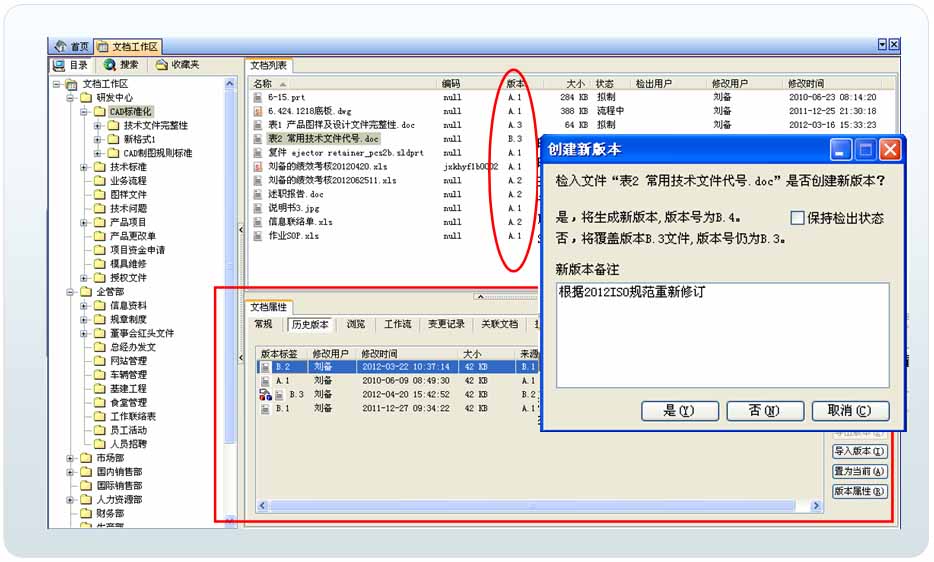 文檔的版本用于控制文檔的有效性及跟蹤文檔的變化歷史。根據(jù)檢入、檢出、修訂操作,系統(tǒng)將自動(dòng)更新版本號(hào),支持大版本和小版本,大的修改可以升級(jí)版本,小的改動(dòng)可以升級(jí)版次。