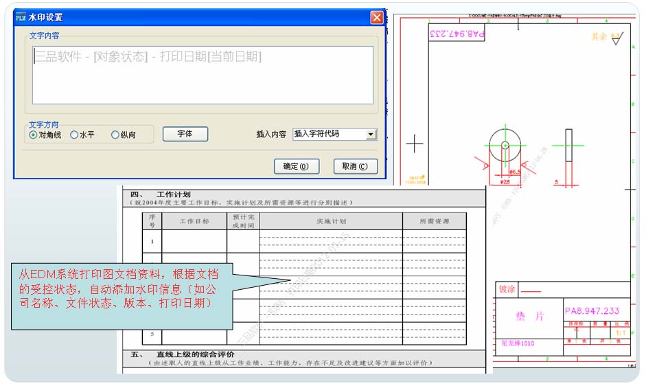 為了更好的標(biāo)識(shí)企業(yè)數(shù)據(jù)管理中心的圖紙等資料的受控狀態(tài),三品軟件開創(chuàng)性的實(shí)現(xiàn)了打印資料的水印標(biāo)識(shí)功能。當(dāng)圖文檔需要打印時(shí),自動(dòng)添加如公司名稱、文檔狀態(tài)、版本信息、打印日期等水印信息。