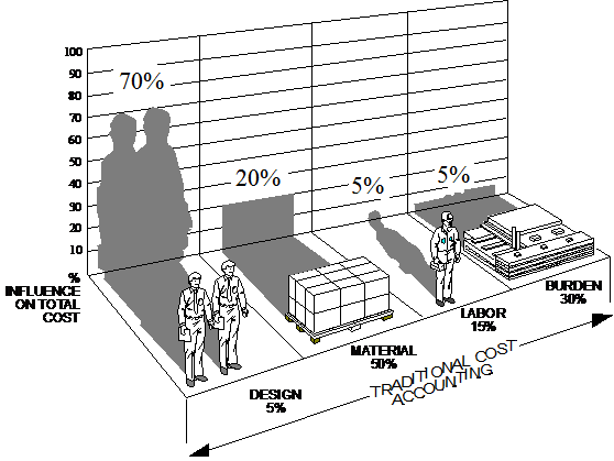 傳統(tǒng)成本統(tǒng)計(jì)一般包括原材料成本、外購?fù)鈪f(xié)零部件成本、加工成本、裝配成本、人工成本(生產(chǎn)線人工和設(shè)計(jì)人工以及管理費(fèi)用),在設(shè)計(jì)部門,甚至往往認(rèn)為產(chǎn)品成本的80%是零件成本,一旦要求減少產(chǎn)品成本,設(shè)計(jì)部門優(yōu)先考慮的是選擇便宜的零部件和材料。