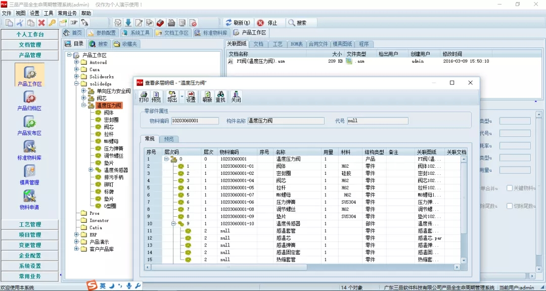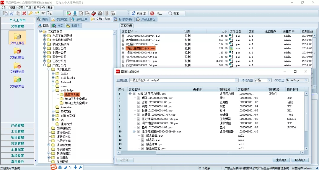 為了更好解決BOM清單的準確性、快速導出等問題,PDM系統(tǒng)支持從Solid Edge圖紙信息中提取屬性信息和裝配信息,自動生成產(chǎn)品結(jié)構(gòu)樹,匯總BOM信息等。