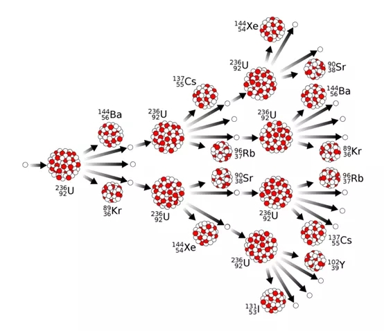 讓我們再來看核裂變的鏈?zhǔn)椒磻?yīng)插圖:
