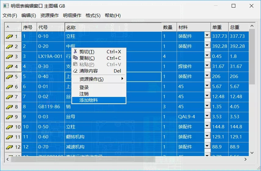 選擇要添加的物料加到圖紙明細(xì)表中。