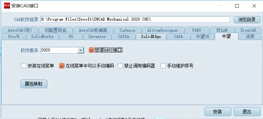 選擇“中望”的安裝目錄、軟件版本等,點(diǎn) “安裝”完成接口的安裝。