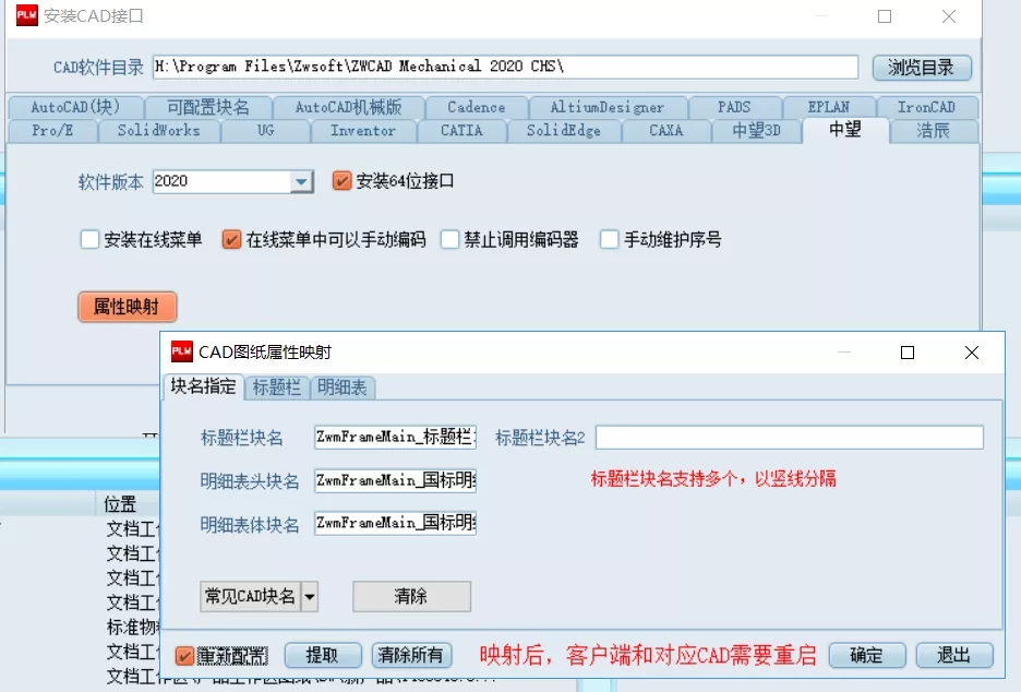 點(diǎn)擊“屬性映射”進(jìn)行圖紙屬性和PDM物料屬性之間的映射關(guān)系設(shè)置: