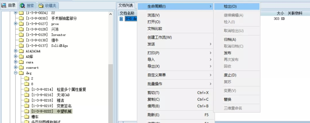 從本地導(dǎo)入一個(gè)中望機(jī)械文件到文檔工作區(qū),并選中它,右鍵—生命周期--檢出