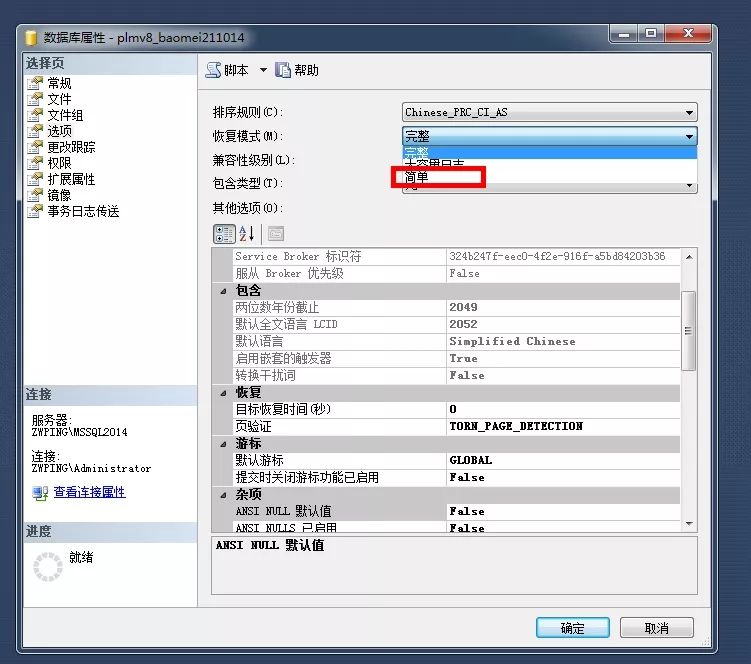 02:修改數(shù)據(jù)庫的恢復(fù)模式為“簡單”模式