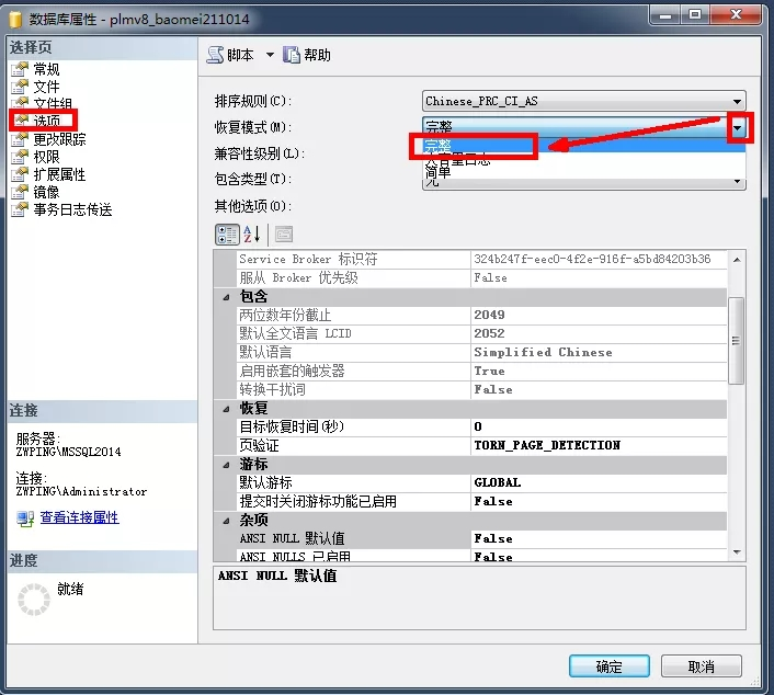 ○數(shù)據(jù)庫-->屬性-->選項(xiàng)-->恢復(fù)模式-->完整