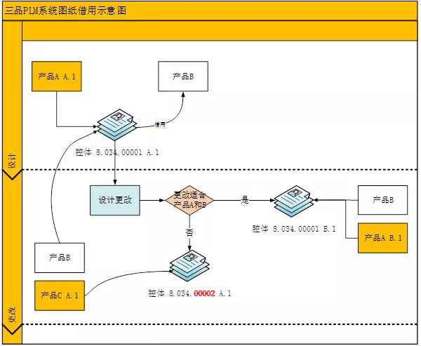 腔體(8.034.00001)圖紙?jiān)O(shè)計(jì)歸檔后,如果需要設(shè)計(jì)更改,系統(tǒng)將提示該圖紙被產(chǎn)品A和B引用。然后人工判斷,該圖紙更改后是否適用于A和B,若是則直接對腔體圖紙升版(B.1),A和B都將引用新版圖紙;如果更改后的圖紙僅產(chǎn)品B能適用,產(chǎn)品A不適用,則需要拷貝一份腔體圖紙,申請新的編碼和圖號(8.034.00002),產(chǎn)品A引用新圖號的圖紙。