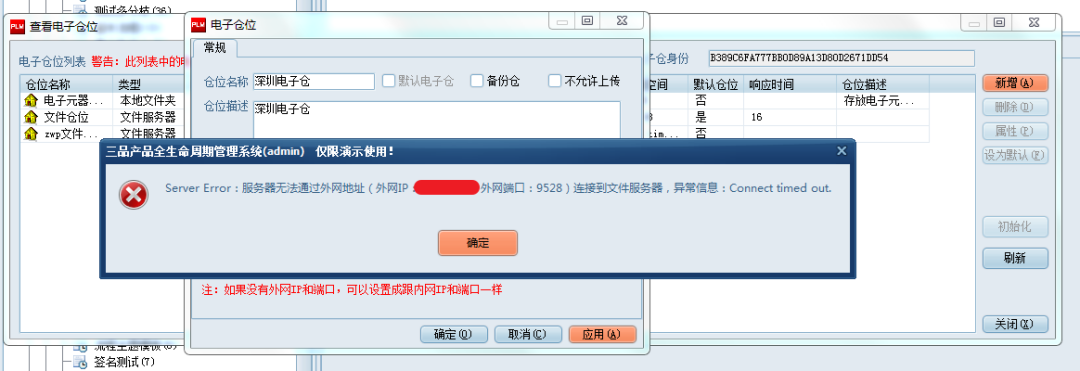 若新增電子倉時出現(xiàn)如下報錯,請在瀏覽器中輸入地址http://外網(wǎng)IP:外網(wǎng)端口/syncloc/訪問異地電子倉,若未返回“文件服務(wù)器工作正常!”,請檢查異地電子倉是否正常啟動或網(wǎng)絡(luò)連接是否正常。