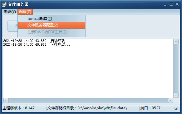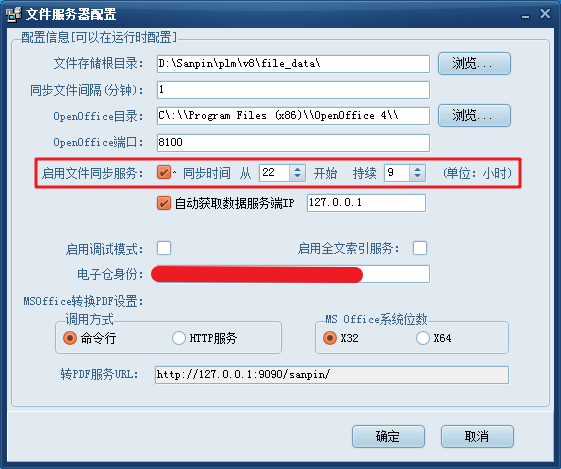 (5)點擊“配置”—“文件服務(wù)器配置”,打開配置窗口,勾選“啟用文件同步服務(wù)”并設(shè)置開始時間和持續(xù)時間后,點擊“確定”完成配置。