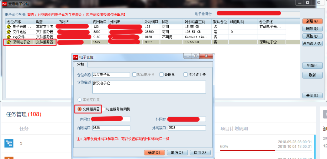 登錄PLM系統(tǒng),在“系統(tǒng)設(shè)置”—“電子倉設(shè)置”打開電子倉管理窗口,點擊“新增”,在“電子倉位”窗體中,勾選“文件服務(wù)器”,輸入倉位名稱、倉位描述、內(nèi)外網(wǎng)IP及端口后,點擊“確定”新增電子倉。按照此方法依次新增深圳電子倉和武漢電子倉。