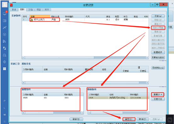 下面只是顯示替換一個(gè)物料的操作,可以瀏覽到新增物料與移除的物料,修改無(wú)誤后點(diǎn)擊確定即可,變更記錄已經(jīng)做好,只需創(chuàng)建工作流進(jìn)行變更生效,如圖5所示: