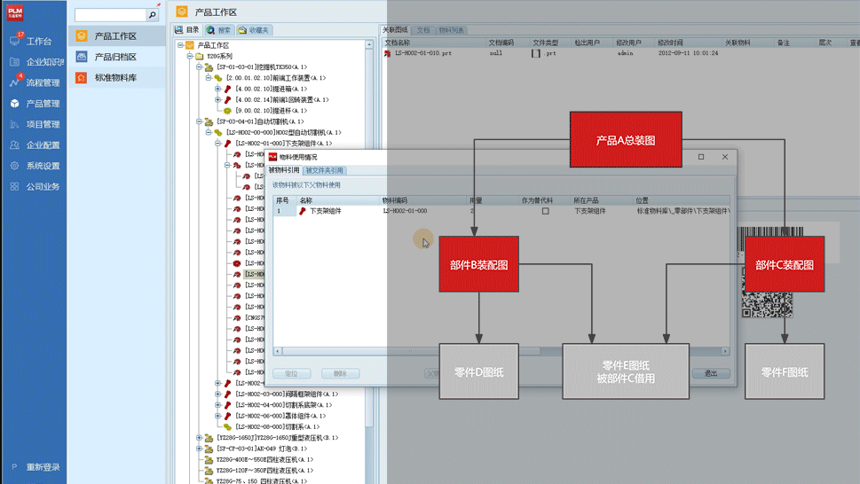 圖:PLM中以BOM結(jié)構(gòu)組織圖紙,清晰展示借用與裝配關(guān)系