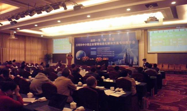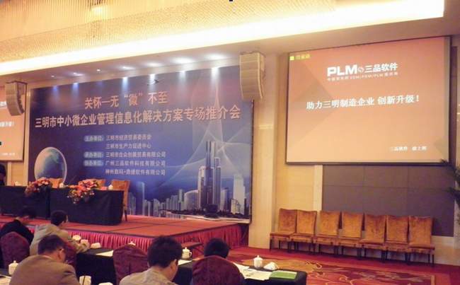 2012年3月30日,在福建三明市五星級賓館天元國際大酒店,三品軟件聯(lián)合三明市經(jīng)濟貿(mào)易委員會、三明市生產(chǎn)力促進中心隆重召開了“三明市制造企業(yè)管理信息化解決方案專場推介會”。 會議目標(biāo)旨在促進三明市制造企業(yè)創(chuàng)新升級,提高企業(yè)生產(chǎn)經(jīng)營管理和數(shù)字化研發(fā)設(shè)計水平,促進信息化和工業(yè)化“兩化融合”,增強企業(yè)市場競爭力。會議受到三明市信息化主管部門的高度重視,市經(jīng)貿(mào)委、生產(chǎn)力促進中心、機械協(xié)會姚慶煥等領(lǐng)導(dǎo)一行出席了本次會議,并在會議上作出了重要的發(fā)言,三明市60余家制造企業(yè),近百人參加了本次會議。